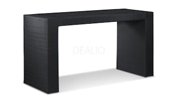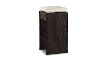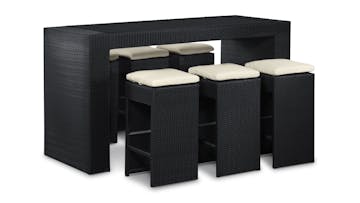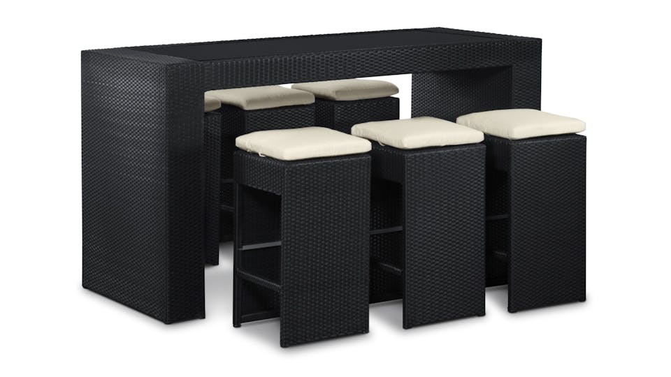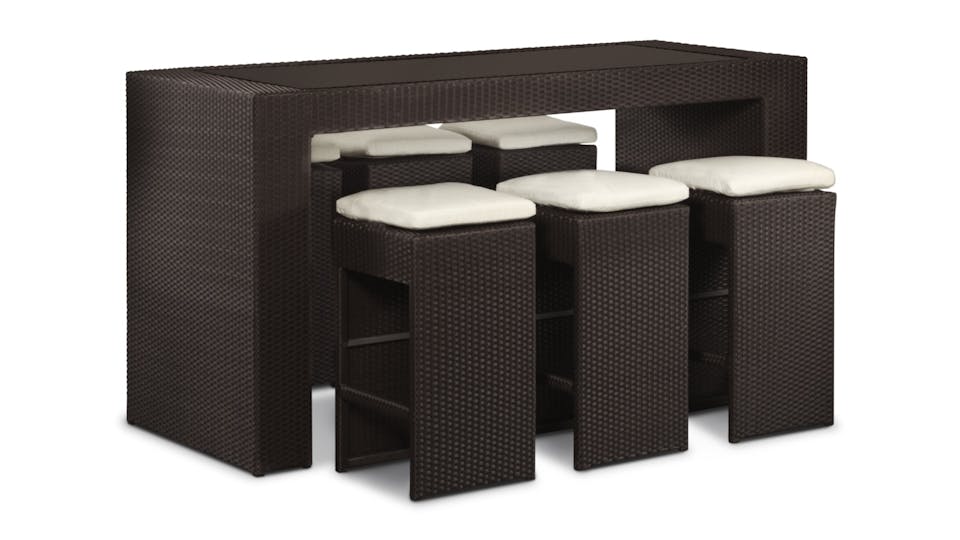 We considered every angle in the design of our Santa Maria Wicker Bar Set, refining the concept of the outdoor bar into this perfectly proportioned package. The bar top features tinted glass recessed into the sturdy wicker frame, at exactly the right height to let you stir up drinks without stooping or straining. The single-sheet of toughened glass provides the perfect work surface for the busy bartender and best of all, no seams allows for an easy wipe down. Completing the set are six wicker bar stools that pack away neatly under the bar when not in use. Topped with a cushion and featuring a thoughtful cross bar to rest your feet on, our bar stools were designed with comfort in mind and an eye for style. Mirroring the U-shaped design of the bar, the closed faces of each stool can be presented outward when stowed under the bar unit for an attractive presentation. An indispensable piece of outdoor furniture for the consummate entertainer, the Santa Maria outdoor bar is just the splash of elan you need for your next poolside cocktail party or the perfect perch for an al fresco brunch for the more virtuous among us.