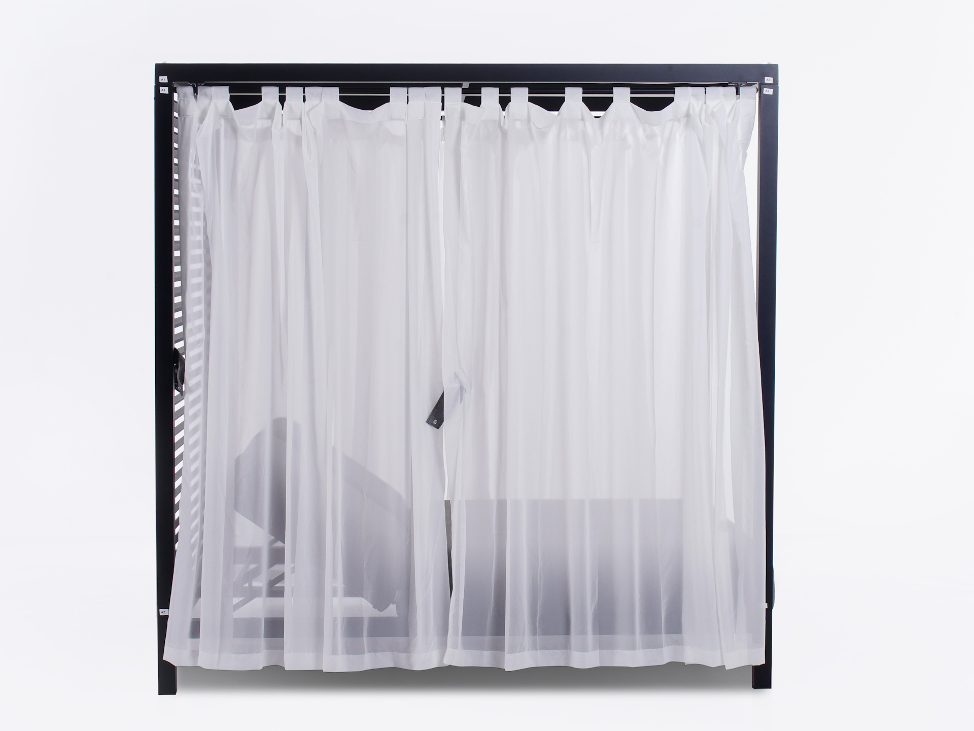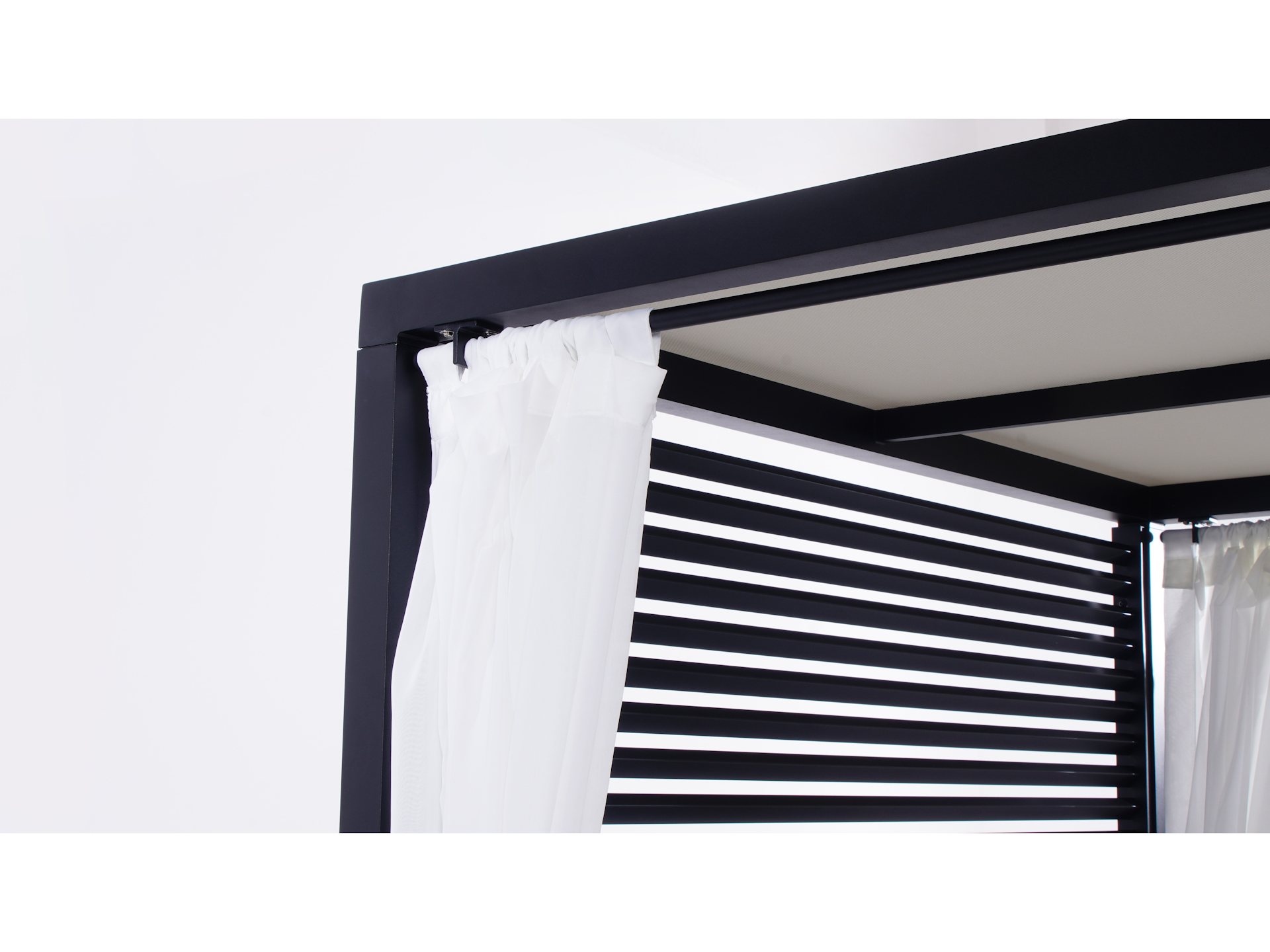 | Four flowing white curtains on rods create an elegant, enclosed look. | |